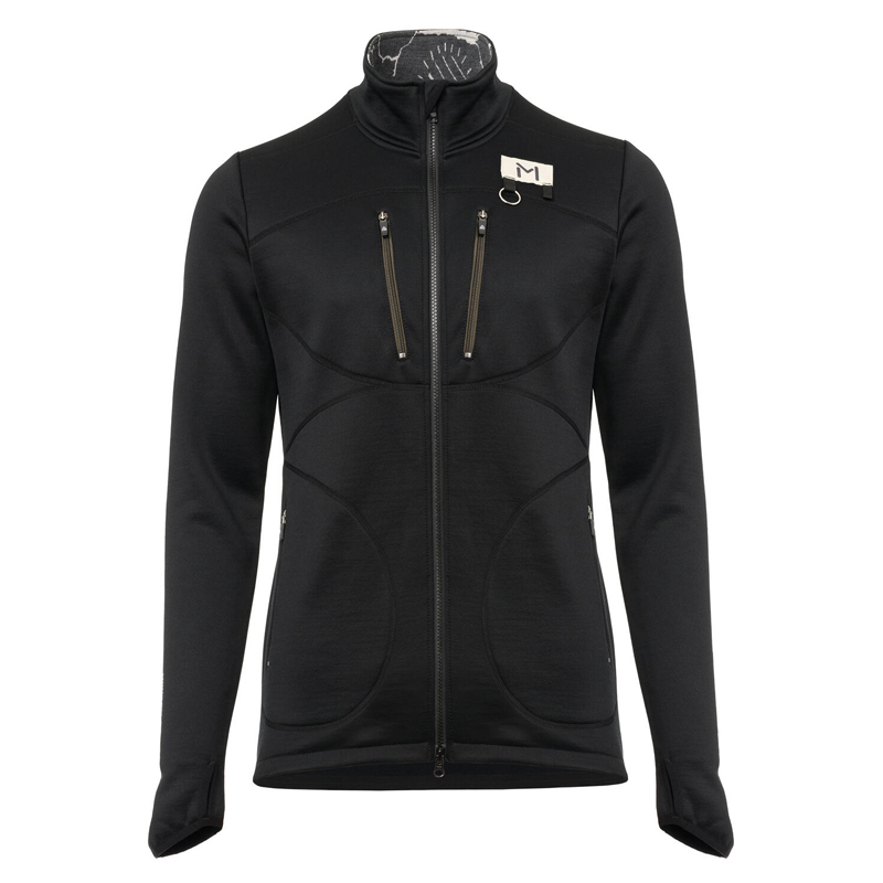 Vier Taschen mit Reißverschluss und Schlaufen zum Aufhängen und Trocknen. Monsen-Logo oben auf der linken Seite. Daumengriff, der das Hemd an Ort und Stelle hält und kalte Zugluft an den Handgelenken verhindert. Die Jacke kann bei schönem Wetter allein getragen werden oder als Zwischenschicht, wenn es kalt ist. Die Innenseite des Halses ist aus Jaquard-Stoff mit Femunden-Muster.