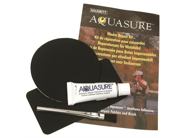 Das Reparaturset besteht aus einer 7-Gramm-Minitube AquaSure, einem Pinsel zum Auftragen einer dünnen Kleberschicht und zwei Flicken, die über das Leck geklebt oder auf der gegenüberliegenden Seite (bei Wathosen) verwendet werden können.
