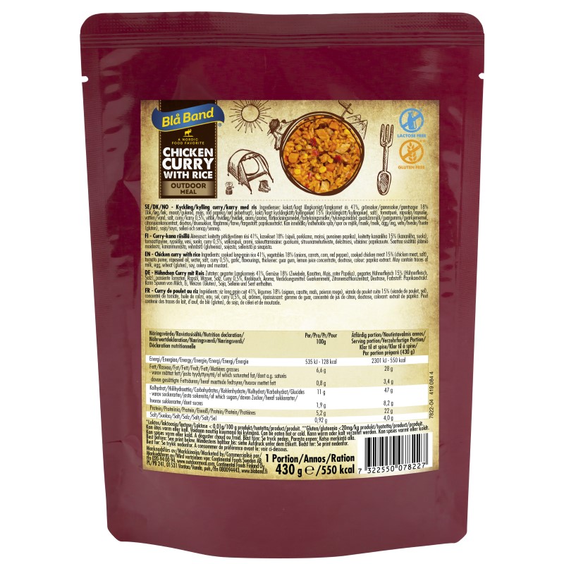 Wasser, Gemüse 18% (Zwiebeln, Karotten, Mais, rote Paprika), gekochtes Hühnerfleisch 15% (Hühnerfleisch, Salz), Tomatenmark, Langkornreis 10%, Rapsöl, jodiertes Salz, Curry 0,5%, Knoblauch, Aromen, Verdickungsmittel: Guarkernmehl, Zitronensaftkonzentrat, Dextrose, Farbstoff: Paprikaextrakt. Kann Spuren von Milch, Ei, Weizen, Soja, Sellerie und Senf enthalten.