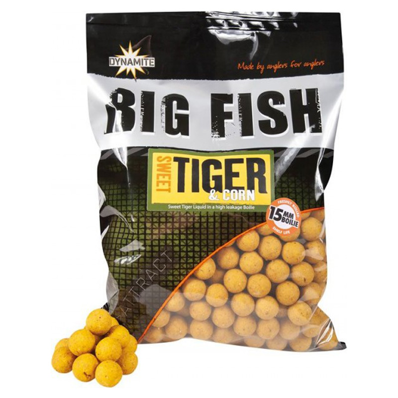 Dynamite Baits Big Fish Sweet Tiger & Corn Boilies 1,8kg, eine fantastische Ergänzung zu unserem Big Fish Sortiment an Boilies. Basierend auf unserem super beliebten Sweet Tiger Liquid mit der zusätzlichen Attraktivität von Mais. Ein Köder mit fester Textur, aber hoher Durchlässigkeit, der sich für die Fütterung auf Distanz eignet. Erhältlich in 1kg, 1,8kg und 5kg Beuteln in 15 und 20mm (20mm Größe nur für den Export).