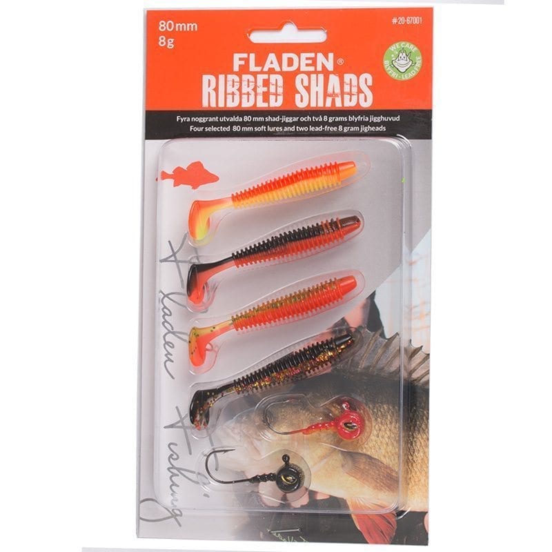 Fladen Jiggsortering Shad 80mm sind vier gerippte Shad-Jigs mit passenden Jigköpfen zum Jig-Angeln auf Barsch, Zander und Hecht. Machen Sie sich bereit für das Sommerangeln mit einem kompletten Set mit vibrierenden Jigs!