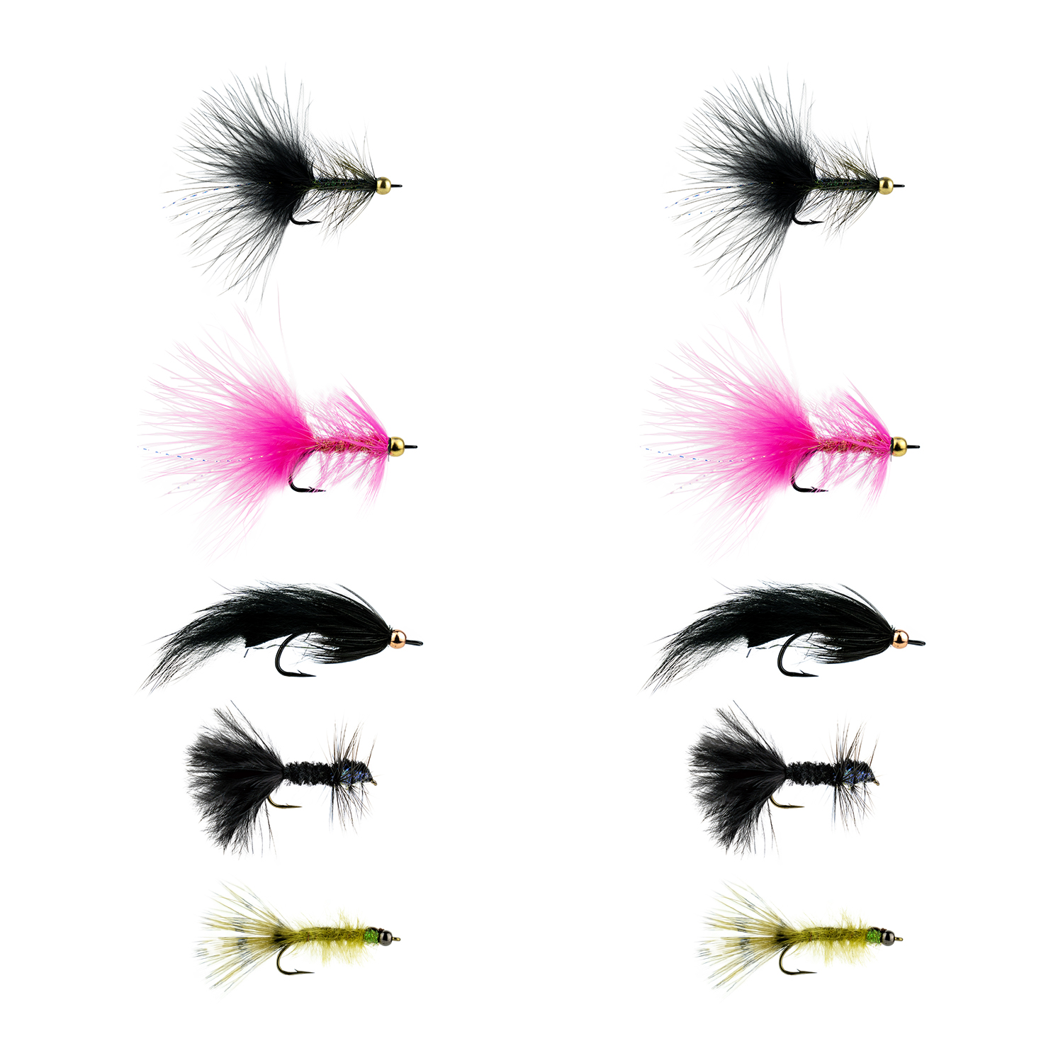 Das "Flugpaket Put and Take 1" enthält insgesamt 10 Fliegen, die speziell für das Forellen- und Regenbogenforellenangeln in Seen und Flüssen entwickelt wurden. Mit fünf verschiedenen Mustern deckt dieses Paket die meisten Situationen beim Fliegenfischen mit Streamern ab.