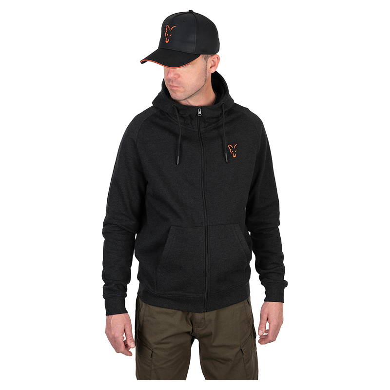 Leichter Kapuzenpulli aus schwarzem Marl mit orangefarbenem Fuchs-Logoaufdruck. Kängurutasche mit interner, versteckter Sicherheitstasche mit Druckknopfverschluss.