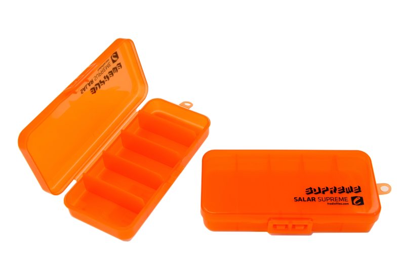 Sie hat fünf gleich große Fächer, perfekt für Trockenfliegen, Mikros oder zur alleinigen Verwendung als Hakenbox. Abmessungen: 14x6x2. 5 cm. 'Äì Langlebiger, hochwertiger Kunststoff'Äì Kühle, sichtbare orange Farbe'Äì Leicht in Taschen zu verstauen