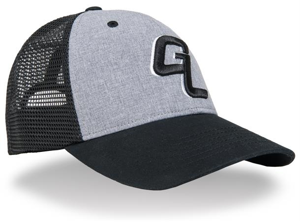 Die Guideline GL Logo Cap ist eine Trucker-Kappe in Heather Grey/Schwarz mit Mesh-Panels für optimale Belüftung.