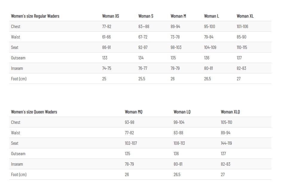 | Frauengröße Queen Wathosen - Maße in cm | ||||||