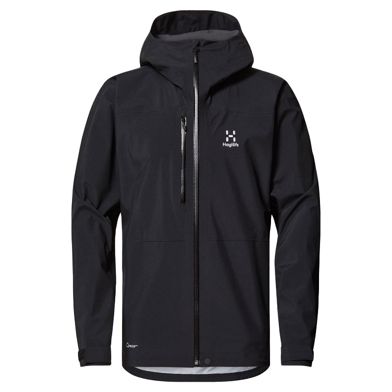 Haglöfs Front Proof Jacket Men True Black - Bedeckter Himmel auf dem Wanderweg? Mit dieser leichten und packbaren Shell-Jacke ist das kein Problem. Sie besteht aus einem strapazierfähigen dreilagigen PROOF™-Gewebe aus recyceltem Polyester mit glatter Oberfläche und einer recycelten Membran, die atmungsaktiven Wetterschutz bietet. Die Belüftung unter den Ärmeln sorgt für ein angenehmes Tragegefühl, wenn Sie unterwegs sind. Außerdem verfügt sie über eine verstellbare Kapuze und ein Paar Reißverschlusstaschen für kalte Hände oder Snacks.