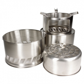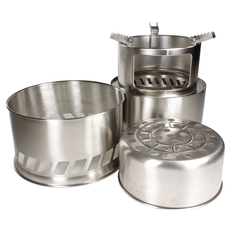 Eine Holzküche, die mit Stöcken oder kleinem Holz befeuert wird und eine kraftvolle und schnelle Verbrennung liefert, was sie zu einem nützlichen Zubehör für das Kochen im Freien macht!