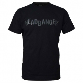 Sehr bequemes schwarzes T-Shirt mit einem dunkelgrauen Headbanger-Logo auf der Brust und im Nacken. Klassisches und stylisches T-Shirt, das sowohl als Angeloutfit als auch als Streetwear hervorragend funktioniert.