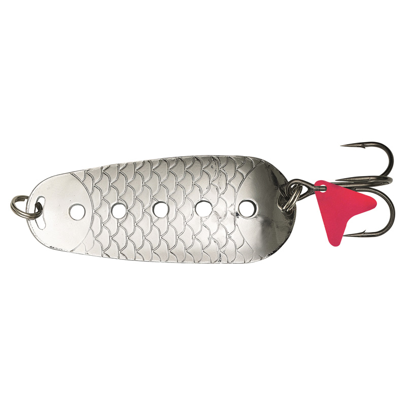The Kinetic Spoony has an erratic action that mimics a fleeing baitfish – delivers underwater vibrations and attention-grabbing flashes. The small holes create subtle vibrations, enticing fish to strike. Works great for big predators like pike and salmon.