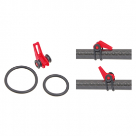 Tragbarer Hakenhalter zur Befestigung an Angelruten. Zwei Ringe für unterschiedliche Stabstärken.