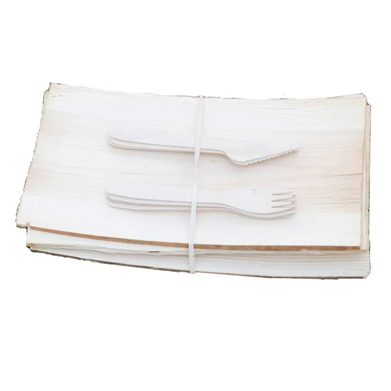 4 Teller mit Holzbesteck, 4 Messer und Gabeln. 8 Stück Besteck.