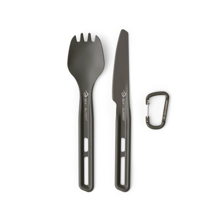 Sea To Summit Frontier UL Cutlery Set 2pcs Spork And Knife - Das 2-teilige Frontier-Besteckset kombiniert Messer und Göffel für Backcountry-Köche, die mit weniger mehr erreichen wollen. Hartanodisiertes Flugzeugaluminium macht diese Utensilien ebenso stark wie leicht; das Sea-to-Gipfeldesign macht sie ergonomisch funktionell. Ein Mini-Karabiner hält das Set zusammen, wenn die Utensilien nach Gebrauch verstaut werden.