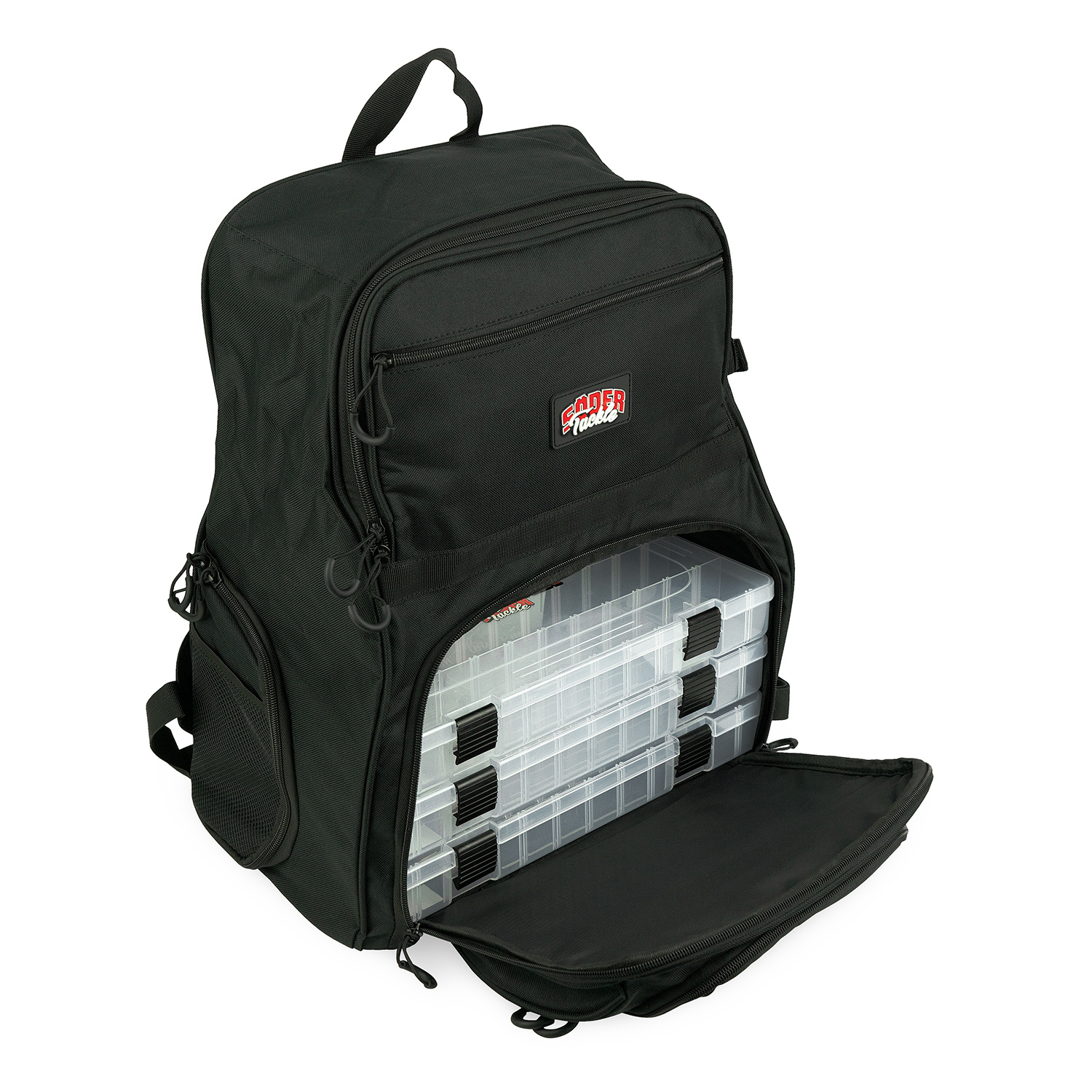 Großer, schwarzer Angelrucksack mit zwei geräumigen Hauptfächern und MOLLE-System, ideal für Angelausrüstung und Zubehör.
