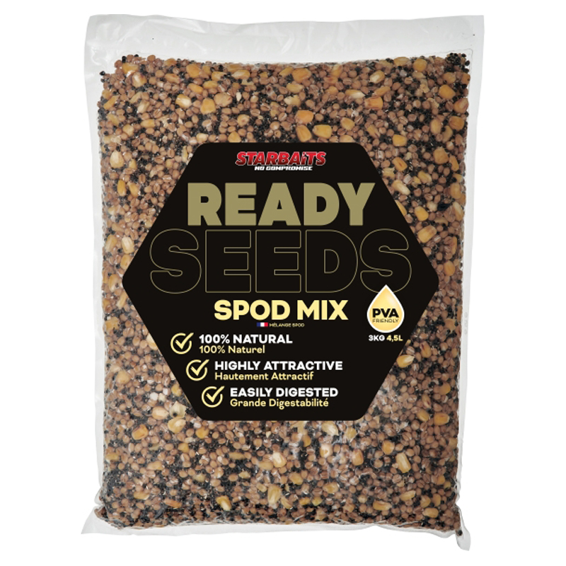 Starbaits Ready Seeds Spod Mix 1kg - Eine gebrauchsfertige Mischung aus Hanf-, Mais- und Weizensamen mit einem natürlichen Aroma. Diese Mischung ist eine hervorragende Ergänzung zu allen Arten von Spodmix-Mischungen und eignet sich auch hervorragend zum freien Anfüttern.