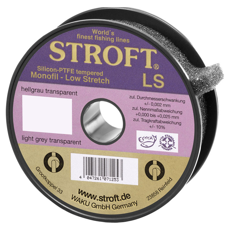 Die LS-Schnur wird aus einer speziellen Polyamid-Mischung hergestellt, um eine Schnur mit sehr geringer Dehnung zu erhalten, die dennoch extrem stark ist. Dies ist jetzt in dieser neuen monofilen Schnur von STROFT mit dem Namen LS (Low Stretch) verfügbar. Laut Tests haben nur geflochtene Schnüre eine geringere Dehnung.