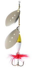 Wipp ist ein Spinner der besonderen Art mit enormen Fangeigenschaften. Der Löffel hat ein Design, das den Körper perfekt unterstützt. Der Körper ist zweifarbig und da die runde Umlenkrolle etwas größer als der Körper ist, liegt der Löffel in neutraler Position auf der Umlenkrolle auf. Dadurch wird die Haftung des Wassers nicht beeinflusst, sondern der Löffel läuft sofort an. Wipp ist mit einem ultrascharfen Haken ausgestattet und hat die Myran-eigene attraktive Klangkonstruktion. Wipp Double ist ein Oberflächen-Spinner. Erhältlich in: 9 und 12 Gramm. Löffelfarben: Silber-Gold-Cups -Schwarz.