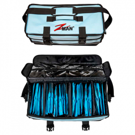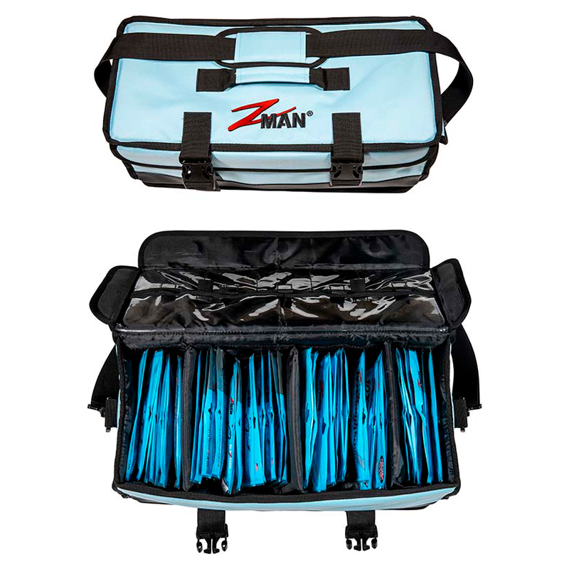 Verstellbare Trennwände isolieren die Köderarten und ordnen die Pakete aufrecht und sicher. Obere Klappen mit Magnetverschlüssen verhindern, dass der Deckel aufspringt und sperren das Wasser aus. Durchsichtige Innenfächer mit Klettverschlüssen bieten zusätzlichen Stauraum für Jigköpfe, Haken und Köder. Außenliegende Netztasche für größere Gegenstände wie Werkzeug und Vorfachspulen. Ein robuster, gummierter Boden verhindert ein Verrutschen auf dem Deck. Für den einfachen Transport verfügt der Bait LockerZ über einen Deckelgriff und einen Schultergurt aus Nylon.